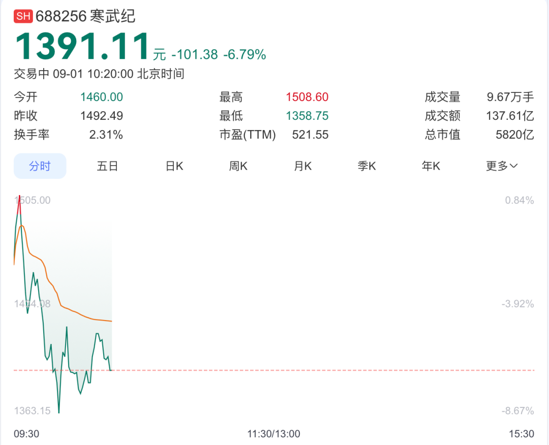 值得一提的是,近期寒武纪股价持续大涨。8月28日股价更是大幅收涨15.73%,收于1587.91元/股,超越贵州茅台(600519)的收盘价格1446.1元/股,正式成为A股“股王”。值得注意的是,今日寒武纪大跌,盘中一度跌超8%。